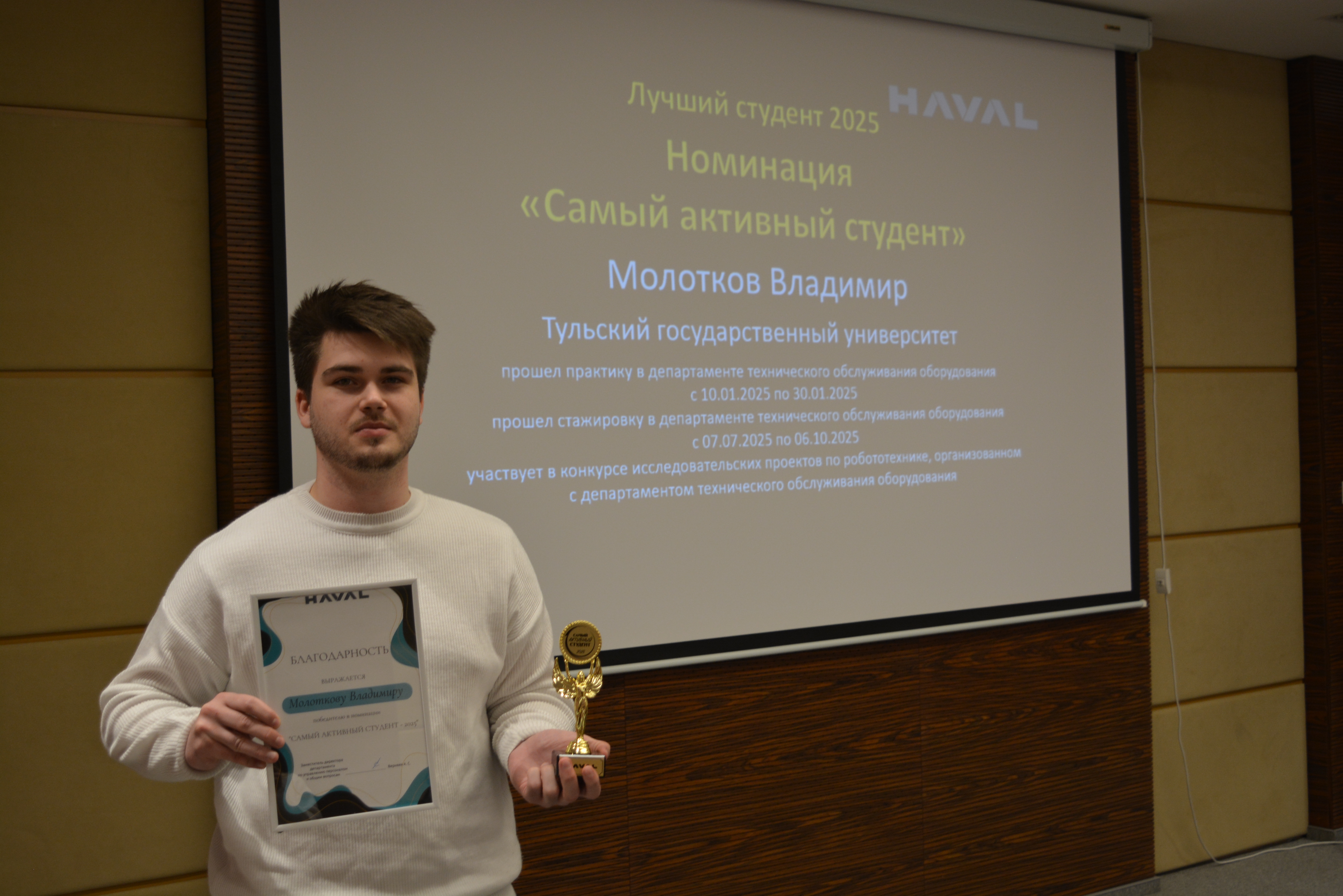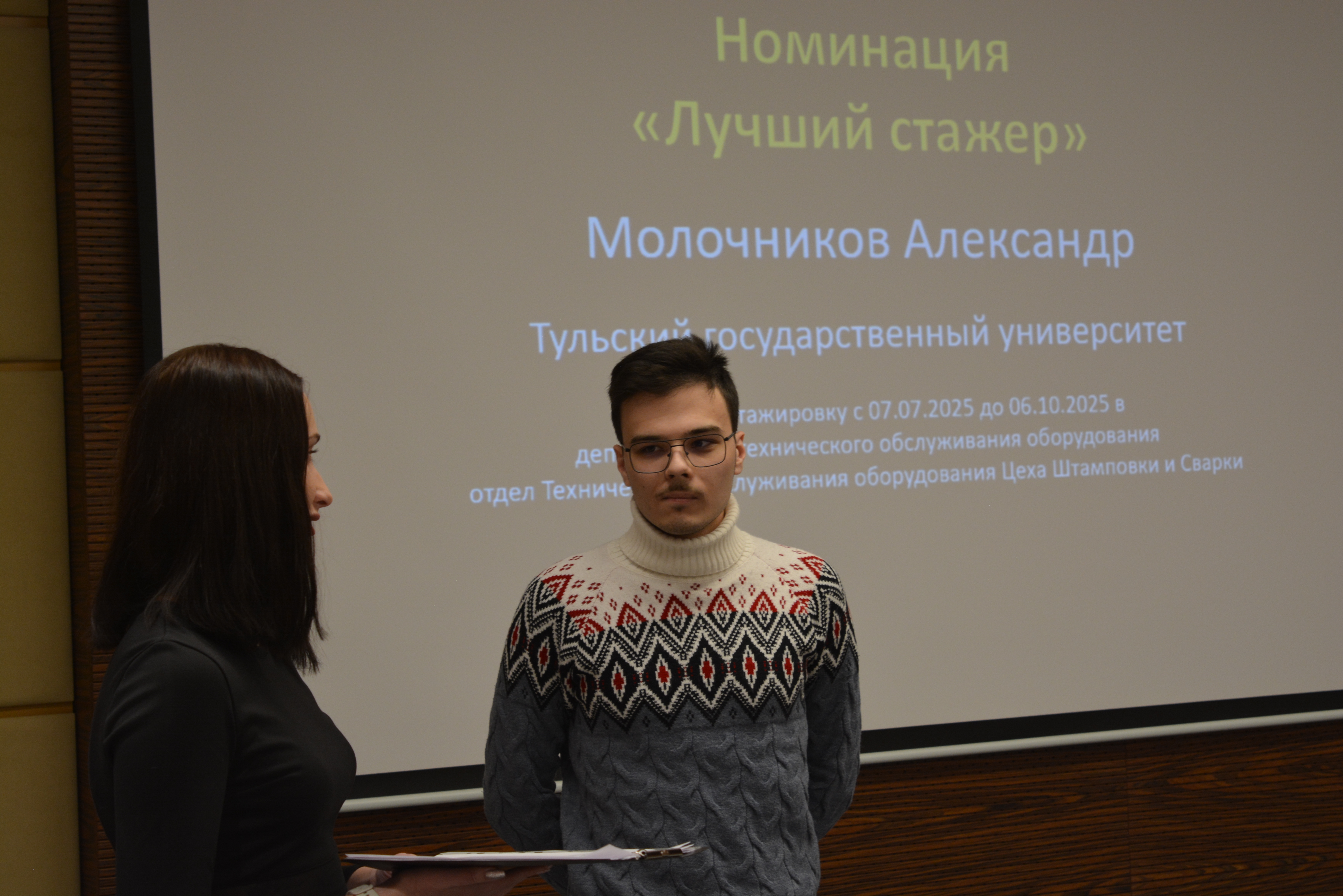 Такое мероприятие предприятие организовало впервые. Отрадно, что в числе тех, кто в этот день получил награду, были четверокурсники направления подготовки «Автоматизация технологических процессов и производств» Политехнического института Тульского государственного университета. Владимир Молотков одержал победу в номинации «Самый активный студент», а Александр Молочников — в номинации «Лучший стажёр».