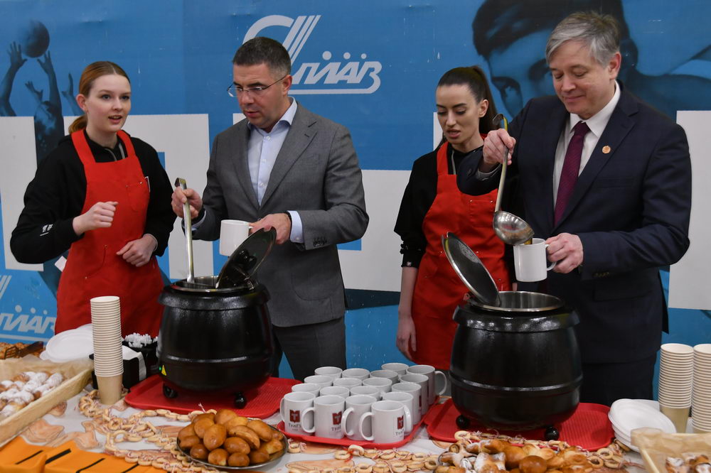 Завершили Татьяниаду-2026 угощения от комбината общественного питания ТулГУ. Все смогли насладиться вкусом знаменитой сосиски по-русски, попить ароматного чая с выпечкой и отведать терпкого сбитня — легендарного напитка студентов. А разливали его по чашкам Олег Александрович Кравченко и Алексей Алоисович Эрк.