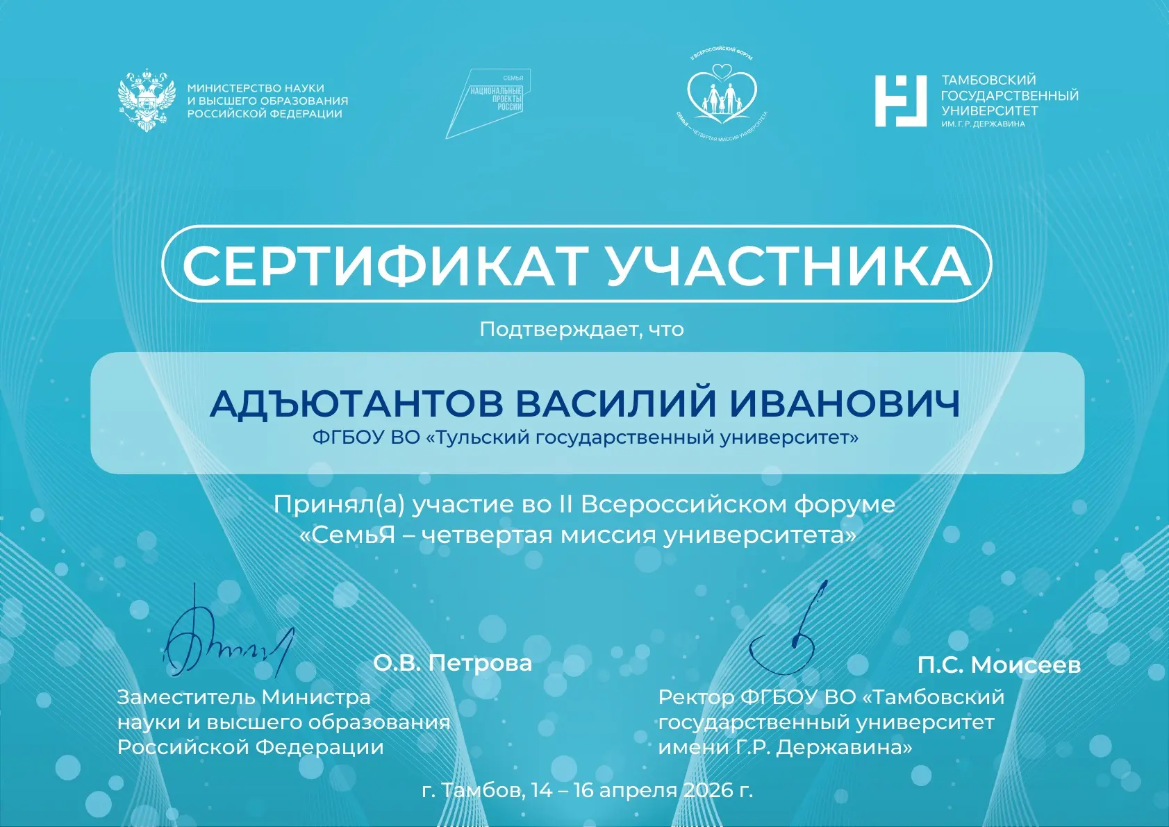 14-16 апреля в рамках федерального проекта «Поддержка семьи» национального проекта «Семья» в Тамбовском государственном университете им. Г.Р. Державина проходил II Всероссийский просветительский форум для обучающихся образовательных организаций высшего образования «Семья — четвёртая миссия университета».